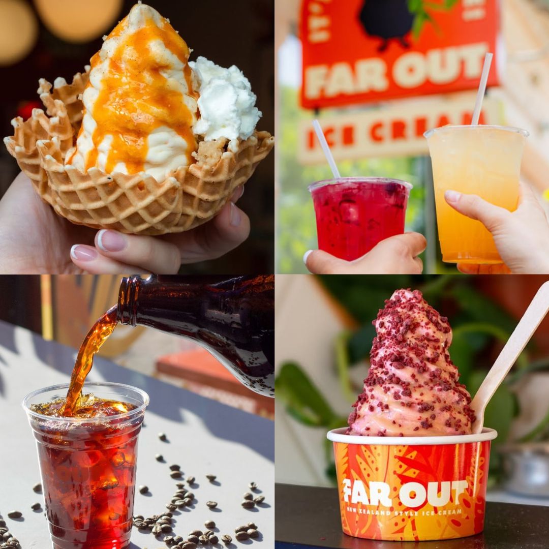 - Food + Drinks: An affogato with a caramel waffle wafer and a choice of topping from Far Out. New Zealand style ice-cream, coffee and other drinks available. Not included.